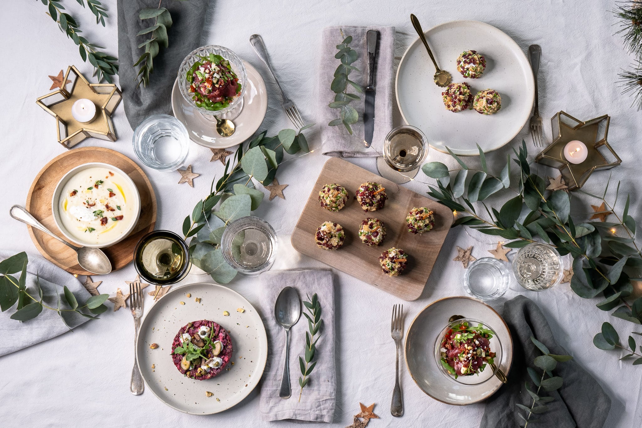 Lichte gerechtjes werken altijd goed: denk aan een feestelijke soep, een frisse salade of een luxe gerecht zoals carpaccio of zalmtartaar. Kies iets dat makkelijk vooraf klaar te maken is, zodat je met Kerst weinig hoeft te doen.
