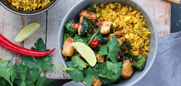 En omdat er deze week nog gewoon gegeten wordt, een makkelijk recept voor bloemkoolrijst met kip en spinazie. Ik zette trouwens mijn favoriete koolhydraatarme recepten voor je op een rijtje, dat artikel kwam vorige week online!