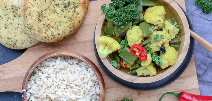 Laat de gele bloemkool curry nu zo’n 20 minuten koken, tot de groenten gaar zijn. Gebruik deze tijd om de rijst volgens de aanwijzingen op de verpakking te bereiden of schuif de naanbroodjes in de oven.