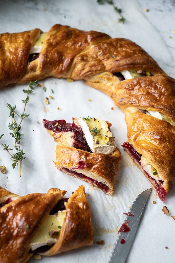 Een feestelijke hartige kerstkrans van croissantdeeg met camembert en cranberry. Heerlijk voor bij de kerstbrunch, voor bij de borrel of als feestelijk hapje vooraf. Vind je het er niet heel gezellig uit zien, deze eetbare kerstkrans? Dit recept zingt het woord Kerst en de combinatie van pittige camembert en zoete cranberry compote zijn echt te gek!