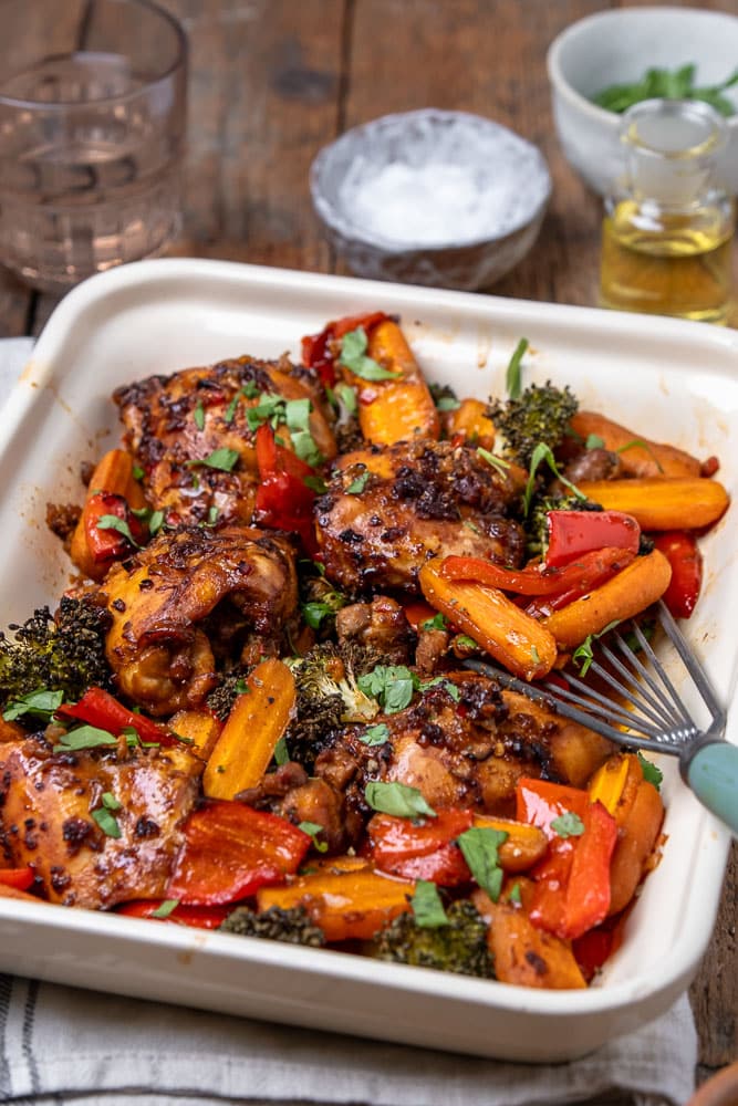 Kippendijen uit de oven, heerlijk gemarineerde kippendijfilet met groenten als makkelijke avondmaaltijd voor doordeweekse dagen. Dit is echt zo’n recept dat je keer op keer wilt klaarmaken: eenvoudig, snel én ontzettend lekker! Door de Oosterse marinade van ketjap, sesamolie, knoflook en gerookt paprikapoeder zit er volop smaak aan deze sappige kippendijen. Voeg daar een mix van groenten aan toe en je hebt een complete, gezonde maaltijd uit de oven.