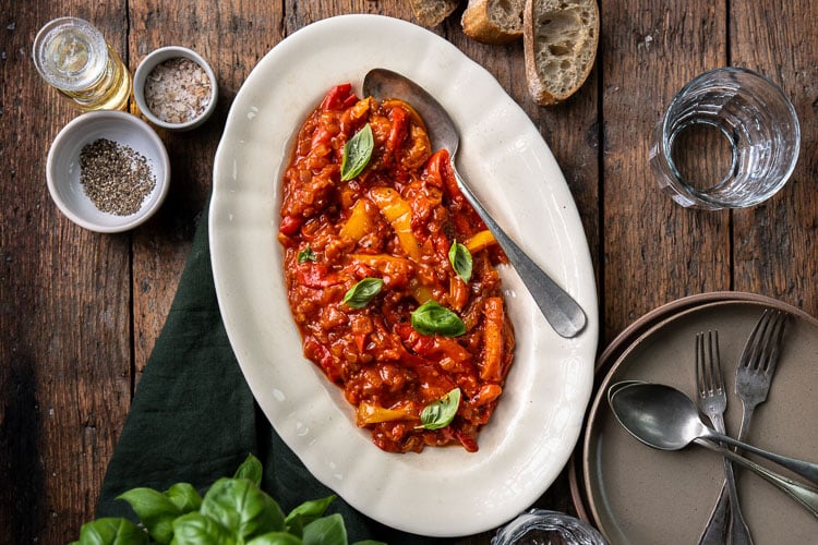 Peperonata is zo’n gerecht dat me meteen terugbrengt naar mijn zomers in Italië. Vroeger maakte nonna deze gestoofde paprika’s voor ons klaar, aan lange tafels vol vrienden en familie. De eenvoud van dit Italiaanse groentegerecht – langzaam gestoofde paprika’s, ui, tomaat en olijfolie – laat de pure smaak van de paprika prachtig naar voren komen.