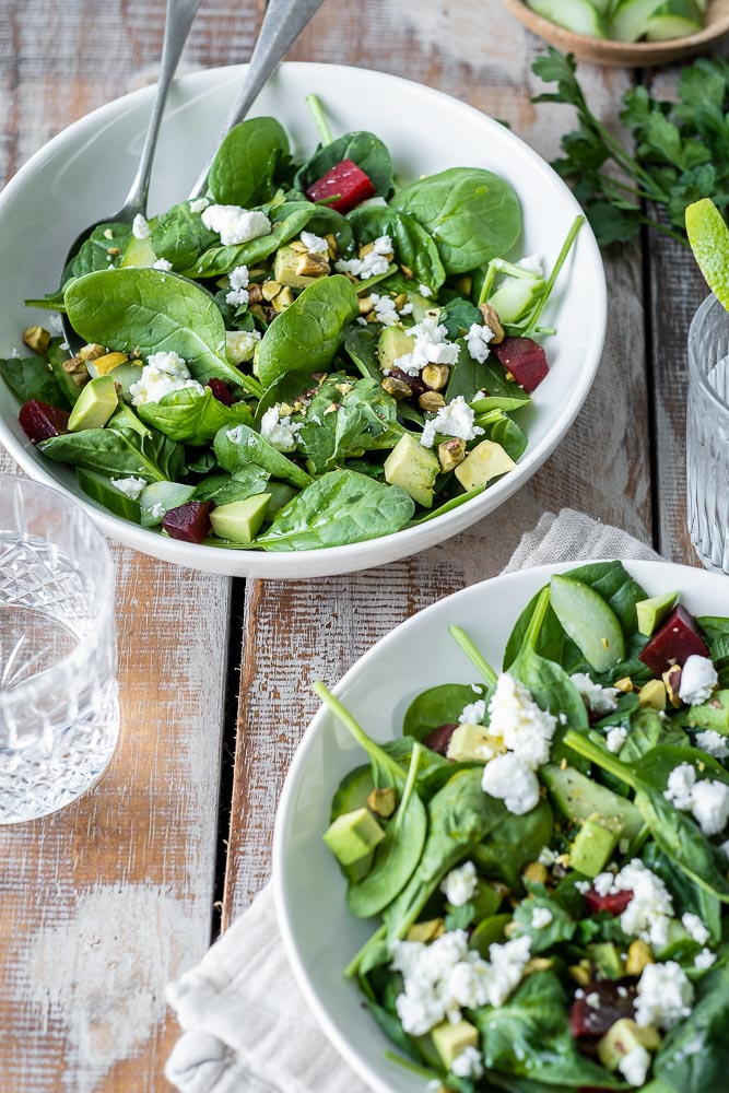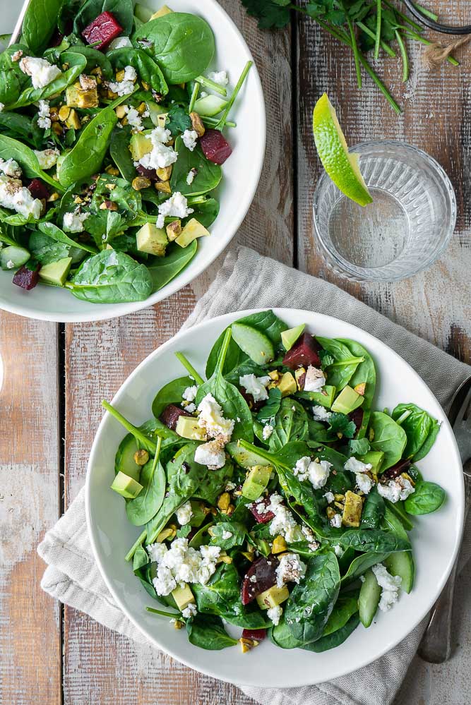 Makkelijk recept voor spinazie salade met geitenkaas, rode biet, avocado en balsamico dressing.