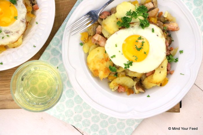 - Verdeel de Tiroler Gröstl over 4 borden, leg op elk bord een ei en strooi nog wat verse peterselie over de borden. Guten appetit!