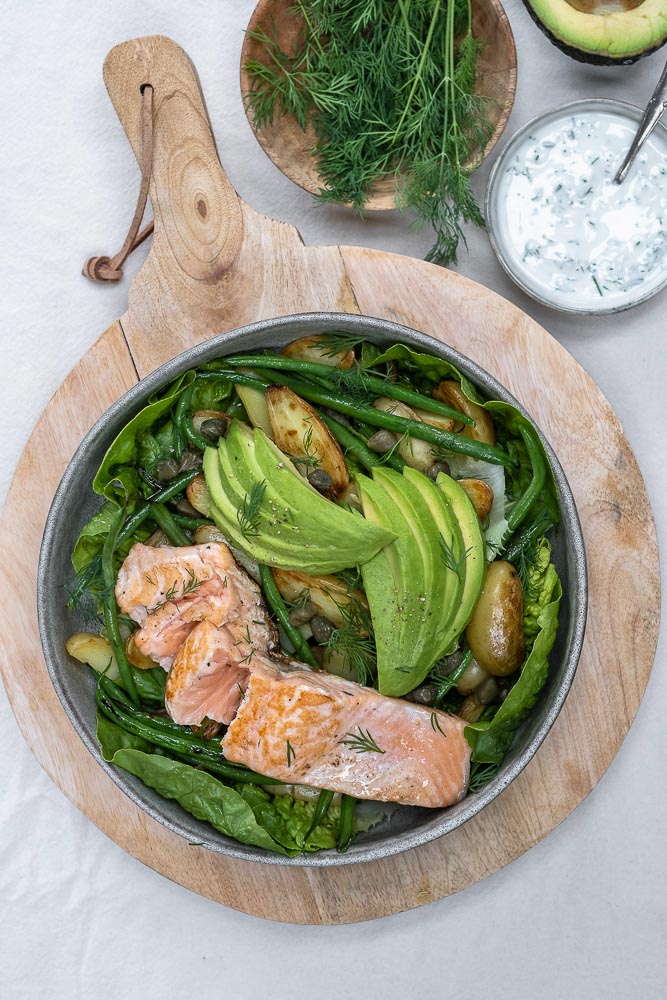 - Tijd om de maaltijdsalade met zalm uit de oven in elkaar te zetten. Haal de krieltjes en zalm uit de oven en steek de zalm in stukjes. Doe de romaine sla in de schaal en voeg hier de krieltjes, zalm, haricots verts, avocado en kappertjes aan toe. Serveer de salade met de yoghurt - dille dressing.