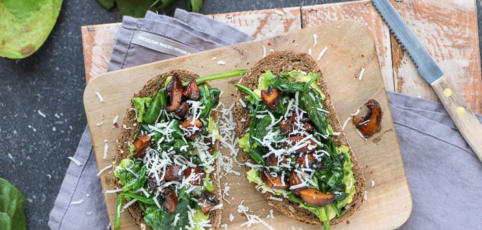 - Schep dan de balsamico champignons met de spinazie over de avocado. Maak de avocado toast met spinazie en kastanjechampignons af met wat Parmezaanse kaas. Buon appetito!