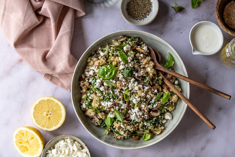 Bij salades denk je misschien vooral aan de zomer, maar geloof me: ook in de herfst kan een rijkgevulde salade heerlijk zijn. Deze quinoa salade met feta is daar een perfect voorbeeld van. Doordat ik champignons en spinazie toevoeg, krijgt de salade een hartige basis die voedzaam genoeg is voor een stevige lunch of als bijgerecht bij het avondeten. De feta maakt het lekker romig, de dressing fris – en het fijne is: je zet dit recept binnen een half uur op tafel.