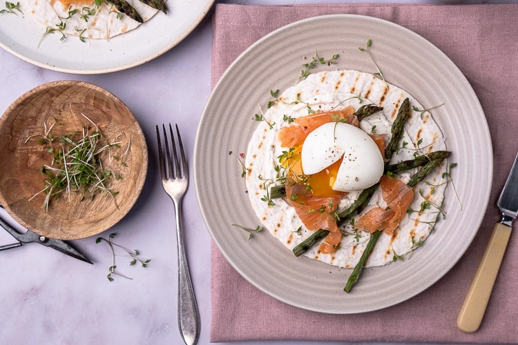 Bij het ontbijt denk je misschien nog niet direct aan tortilla wraps… maar eigenlijk zie je deze wraps in dit recept als een soort broodje. Of een hartige pannenkoek, dat lijkt er misschien meer op. De wraps kun je met allerlei lekkers beleggen en ik hou wel van een hartige ontbijt wrap met gerookte zalm, knapperige asperges en frisse groente kiemen.